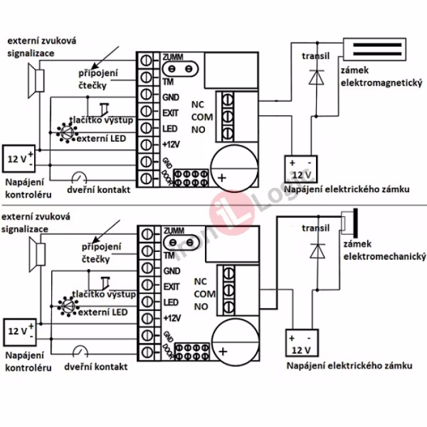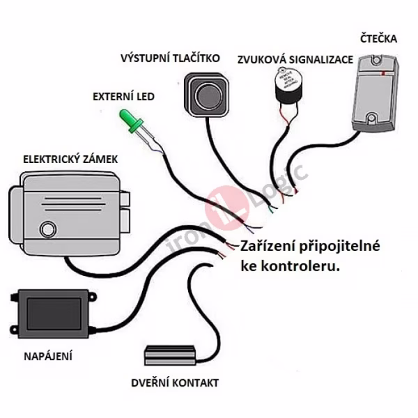 Kontrolér je součástí přístupového systému. Obsahuje potřebnou elektroniku a svorkovnice pro připojení napájení, čtečky, elektrického zámku a dalších zařízení. V paměti kontroléru jsou uložena identifikační data jednotlivých čipů. Způsob připojení čtečky odpovídá přenosovému protokolu dat mezi čtečkou a řídící jednotkou. V našich instalacích používáme protokoly WIEGAND a jednodrátové TM. Načítání nebo mazání čipů v paměti kontroléru a nastavování základních uživatelských parametrů můžeme provádět pomocí MASTER KARTY nebo propojek na kontroléru. Pokud používáme k administraci dat počítačový software používáme pro přenos dat mezi kontrolérem a počítačem převodníky nebo vybrané typy načítacích čteček. Tomu odpovídá i způsob připojení k počítači. Používají se kabely USB, MICRO USB, kabely s koncovkami RJ 45 nebo speciálními konektory. Načtení identifikačních dat čipů při administraci usnadňuje použití načítací čtečky. Při výpadku napájení zůstanou data v kontroléru.