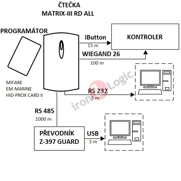 Čtečka MATRIX lll RD-All-DG Wiegand 26 1-wire(TM) RS232 RS485 povrchová tmavá šedá, 125 kHz EM MARINE, HID ProxCard ll, 13,56 MHz MIFARE RFID kontrola vstupu IRON LOGIC.